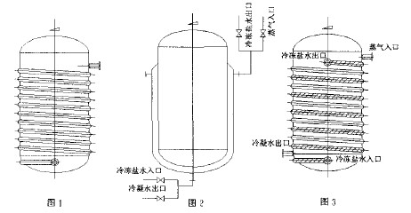 該廠大部分“U”夾套結(jié)構(gòu)反應(yīng)釜為常壓操作,而“U”型夾套內(nèi)常通 人0.3MPa-0.6MPa的蒸汽加熱,按《壓力容器安全技術(shù)監(jiān)察規(guī)程》劃分, 為類(D1級)壓力容器。有些反應(yīng)釜內(nèi)是冷~熱間隔操作的,有時夾 套會出現(xiàn)使用冷凍鹽水降溫后再通入蒸汽的工況,這樣一旦誤操作會發(fā)生冷凍鹽水流失,造成浪費(見圖2)。采用雙螺旋半圓管夾套,使冷凍鹽水和蒸汽各行其道,可以徹底杜絕傳熱介質(zhì)摻混和流失的問題(見 圖3)。鑒于以上原因,我們對該廠的這一類型設(shè)備進(jìn)行了更新和改造, 設(shè)計了半圓管夾套來代替“U”型夾套。