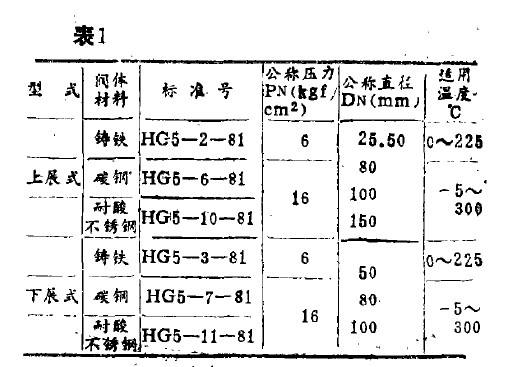 截止型放料閥是目前的4準(zhǔn)放料閥,1967年起編入化工部部頒標(biāo)準(zhǔn),它是直接安裝于反應(yīng)釜底部的專用放料閥門,其關(guān)閉件一一閥瓣是沿放料口通道中心線作上下移動(dòng)的,按其開啟時(shí)的閥瓣運(yùn)動(dòng)方向不同,分為上展式和下展式二種,不論是上展式或下展式,在關(guān)閉狀態(tài)時(shí),都能使閥瓣頂面與釜底面大致吻合,不存在沉積料液的死角。圖1為下展式放料閥的裝配簡圖,此類放料閥按化工部標(biāo)準(zhǔn),閥體可采用鑄鐵、鑄鋼和耐酸不銹鋼三種材質(zhì),其中耐酸不銹鋼放料閻按制造工藝又分成鑄造閥休和焊接閥體兩種形式。上述主要型式的標(biāo)準(zhǔn)號(hào)性能參數(shù)見表1。