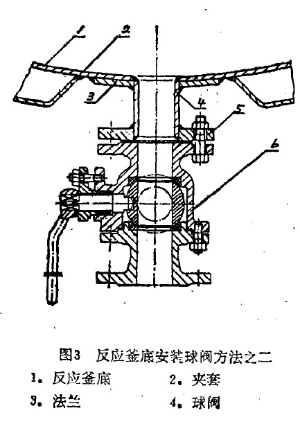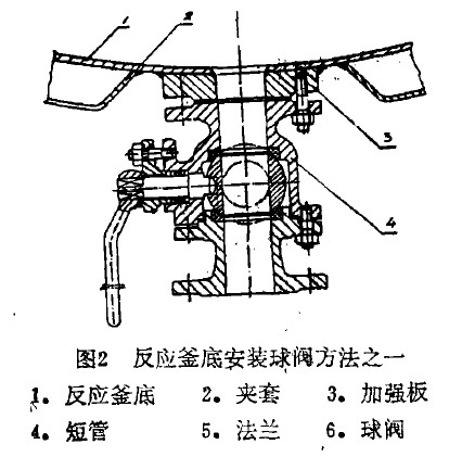 此形式是標(biāo)準(zhǔn)放料閥的性能不能滿足要求時(shí)的常用方式,可任意選用材-料相性能規(guī)格能滿足要求的通用型截止閥、閘閥或球閥等作為放料閥。近廿余年來由于球閻的迅猛發(fā)展,球閥具有流阻小、體積小,重量輕、操作靈便、不易積料等優(yōu)良性能,當(dāng)前大多都選用通用球閥安裝于放料的短管下作放料閥,如圖2所示。由于球閥有低壓和中壓多種壓力等級(jí)可選用,故此種形式在低鹺和中壓反應(yīng)釜上都可適用。