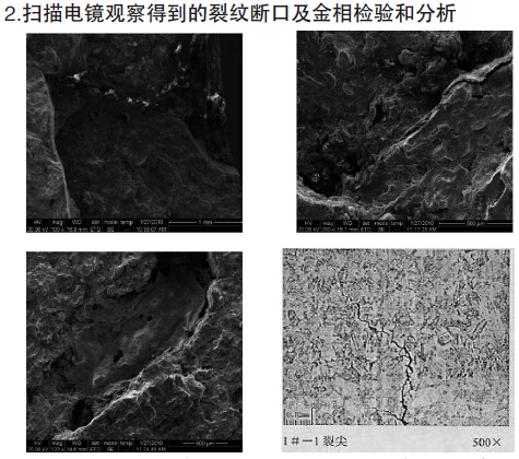 裂紋部位電鏡照片對的裂紋進(jìn)行微觀形貌分析,斷面金相檢查時(shí)發(fā)現(xiàn)晶界或其毗鄰區(qū)域發(fā)生局部腐蝕,甚至晶粒脫落,腐蝕沿晶界推進(jìn)較為均勻,沿晶界產(chǎn)生的腐蝕即為晶間腐蝕。該縱焊縫與環(huán)焊縫交界處在焊接過程由于受某些因素影響,焊后在焊縫中殘留一些焊接冶金反應(yīng)的非金屬夾雜物。破壞了焊縫的連續(xù)性,每條細(xì)小的夾雜物都可看成是一條潛在的小裂紋。